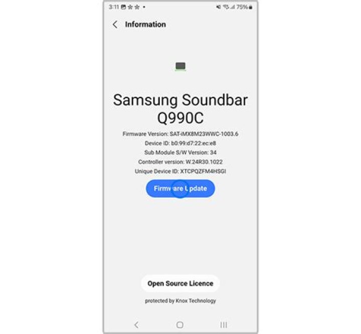 Unplug the soundbar, the subwoofer, and the rear speakers for 30 seconds, and then plug them back in. Open the SmartThings app on your phone and select the soundbar to access its control menu. Tap the 3 vertical dots in the top right corner of the screen. Navigate to Information > Firmware Update > Update Now.