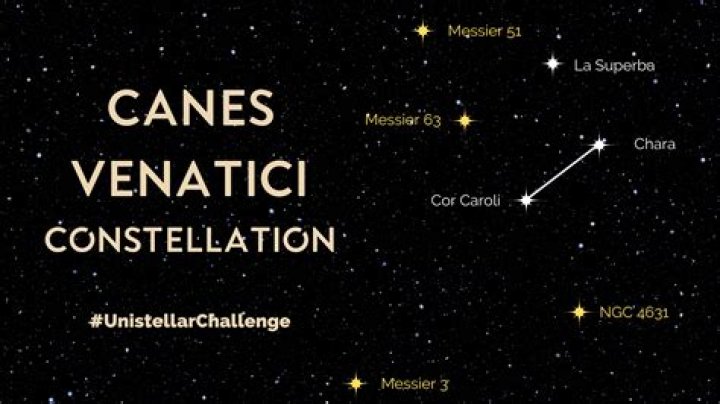 Its name is Latin for ‘hunting dogs’, and the constellation is often depicted in illustrations as representing the dogs of Boötes the Herdsman, a neighboring constellation.