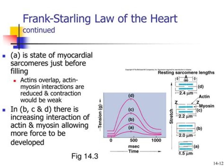 In heart failure, the Frank–Starling curve is moved down and flattened due to reduced inotropy, so that more venous return and hence preload is required to increase stroke volume. As venous return and preload rise, myocyte stretching occurs that increases sarcomere length.